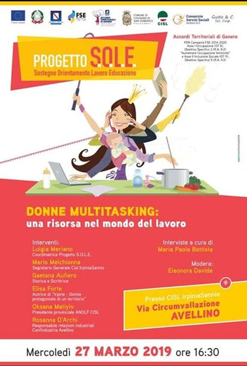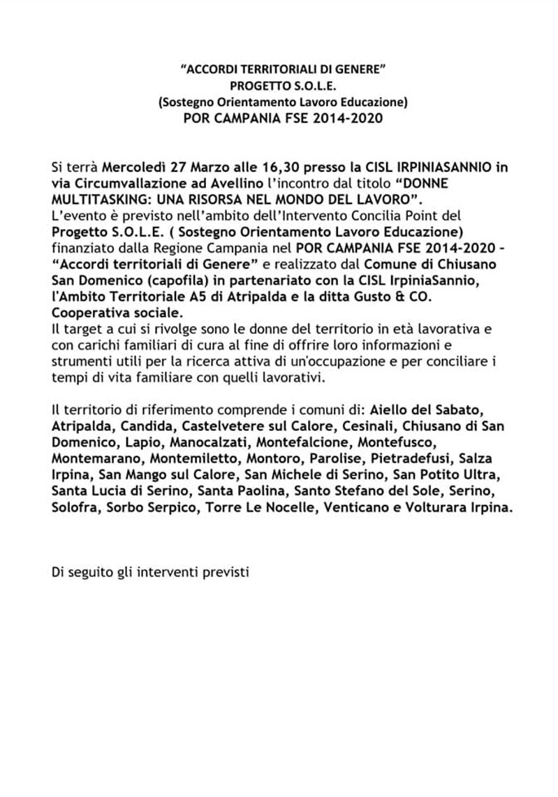 L’evento è previsto nell’ambito dell’Intervento Concilia Point del Progetto S.O.L.E. ( Sostegno Orientamento Lavoro Educazione) finanziato dallaRegione Campania nel POR CAMPANIA FSE 2014-2020 – “Accordi territoriali di Genere” e realizzato dal Comune di Chiusano San Domenico (capofila) in partenariato con la CISL IrpiniaSannio, l'Ambito Territoriale A5 di Atripalda e la ditta Gusto & CO. Cooperativa sociale.